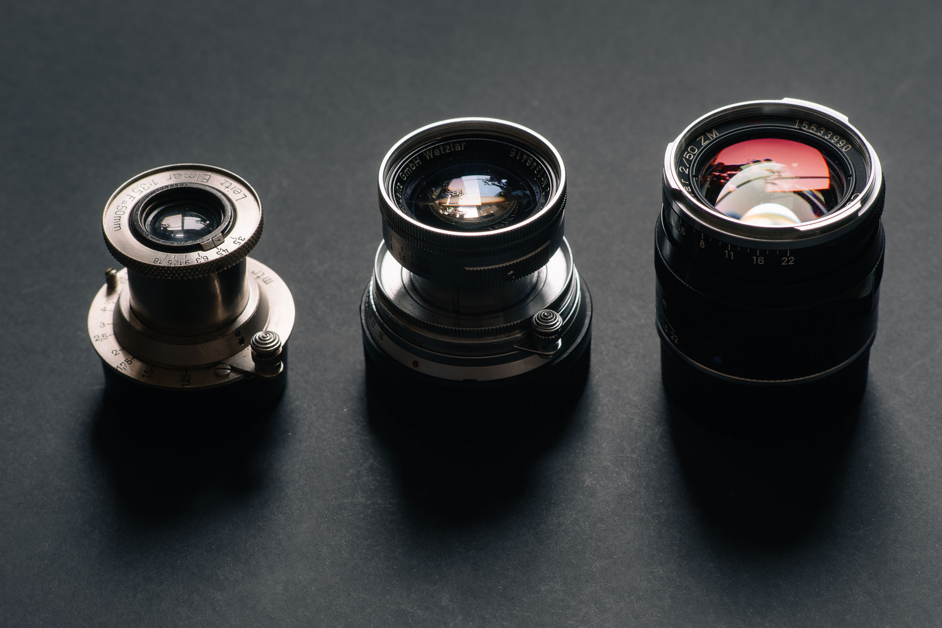 Here the Summicron is placed between the Leica Elmar 50/3.5 LTM on the left and the Zeiss ZM 50/2 Planar on the right. Collapsed the Summicron is quite small, though not quite as tiny as the Elmar (it’s actually very close in size to the nice little Voigtländer 50/2.5 at this point).