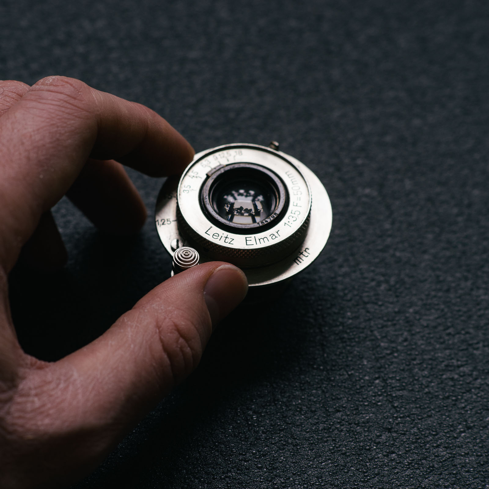 Setting the aperture is very fiddly on the Elmar. You do it using an absolutely tiny lever on the front face of the lens. So not only do you need to be looking at the front of the lens, but you also need to push it around using a finger nail.