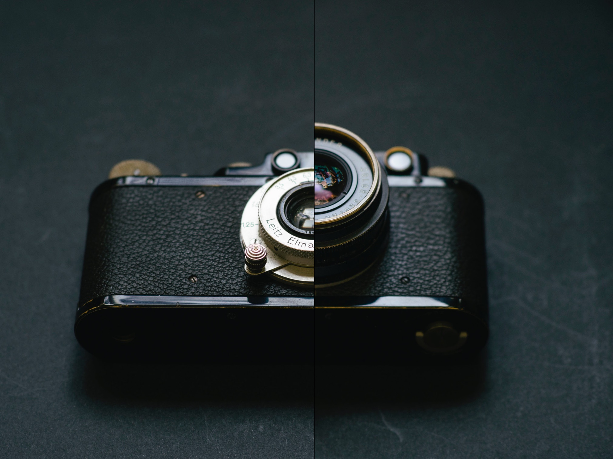 The Elmar 50/3.5 and Voigtländer Skopar 50/2.5 juxtaposed, mounted on the Leica II. There are certainly some appealing lenses out there, but very few come close to being as compact as the Elmar. Even the Skopar, among the smallest rangefinder 50's, looks huge in comparison to the Elmar.