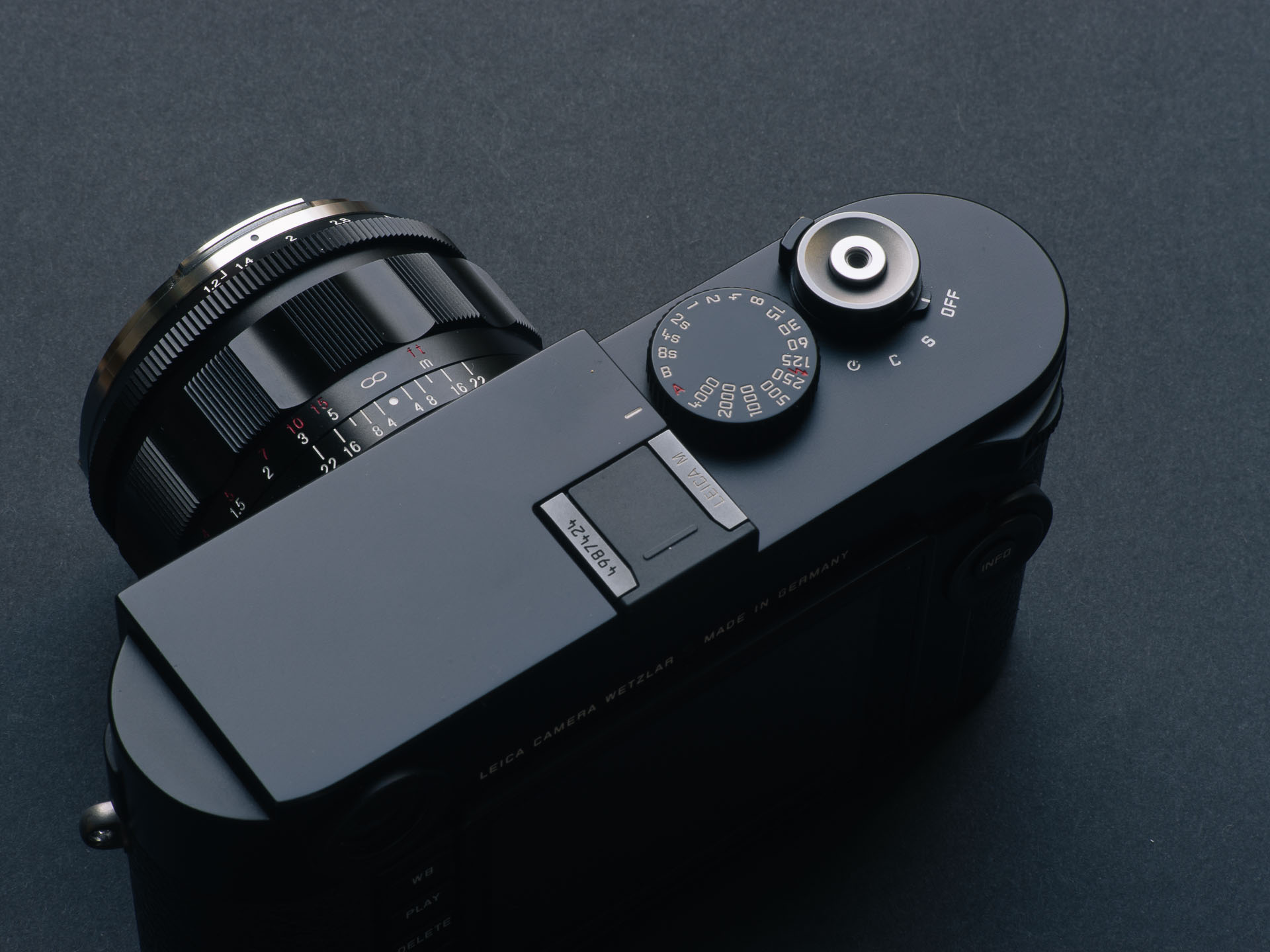 Markings are engraved and painted in the Helvetica Neue typeface. Aperture, metric distance and depth of field scales are painted white with excellent visibility in any light. The imperial distance scale is painted red and not quite as readable in low light.