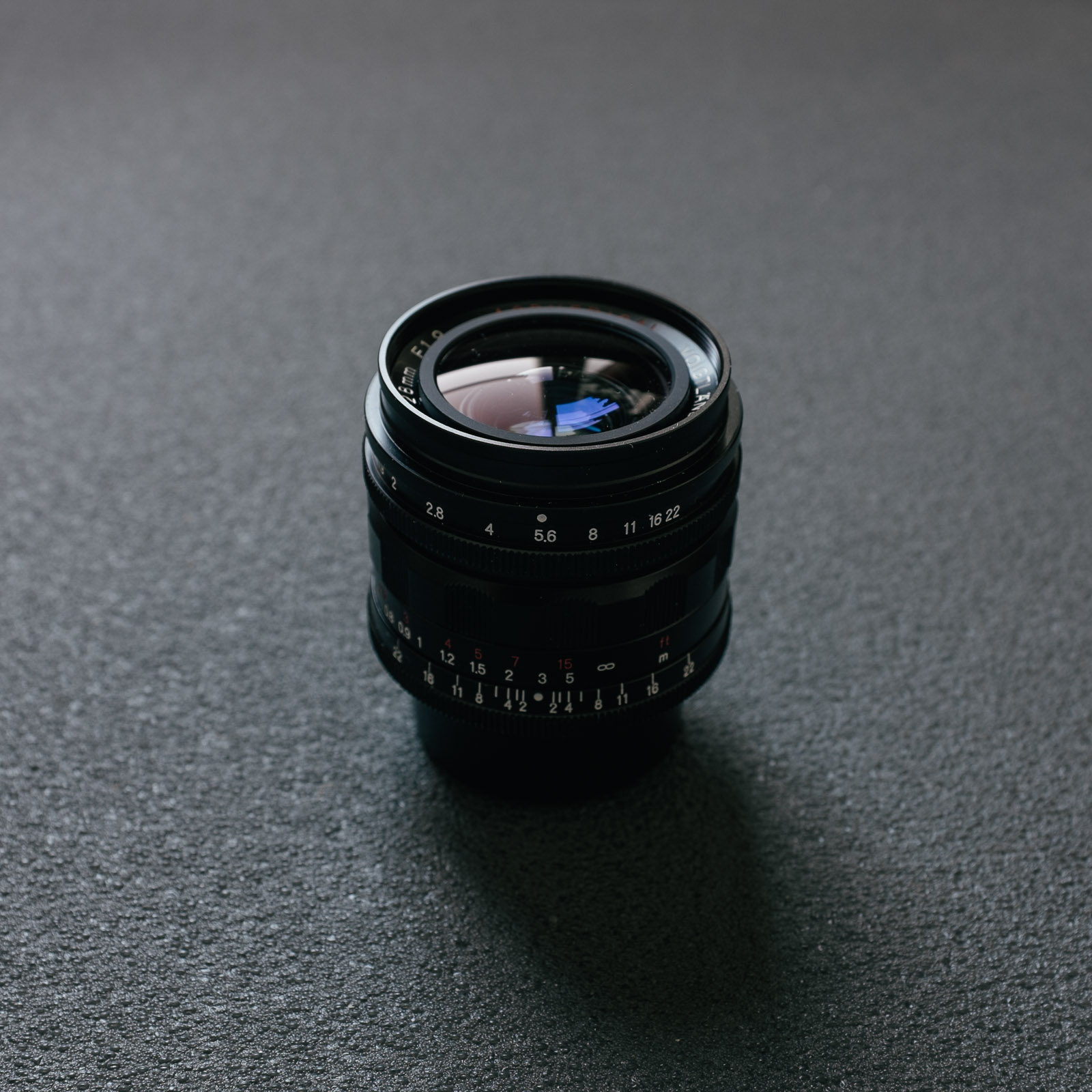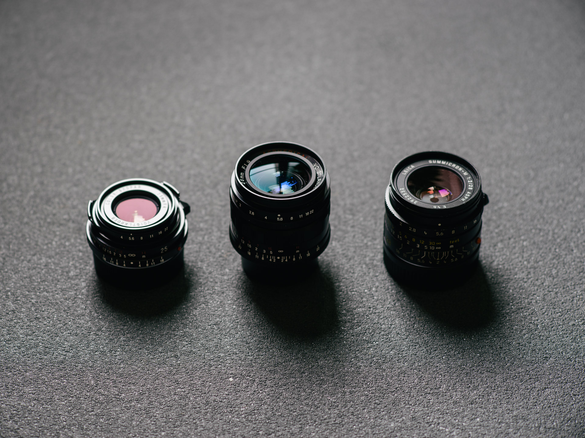 Placing the Ultron (middle) next to a few of the alternatives gives a bit of context to the size. Compared to the Voigtländer 25/4 on the far left the Ultron looks huge, but remember the two stop difference in light gathering. The Leica Summicron 28/2 ASPH on the right is slightly smaller, making for a little bit less viewfinder blockage.