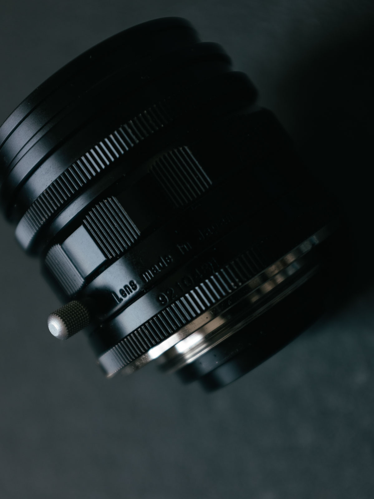 Note the finely ribbed aperture dial closest to the front of the lens, as well as the scalloped focus ring with ribbing in the grooves. The focusing lever is also mounted here.
