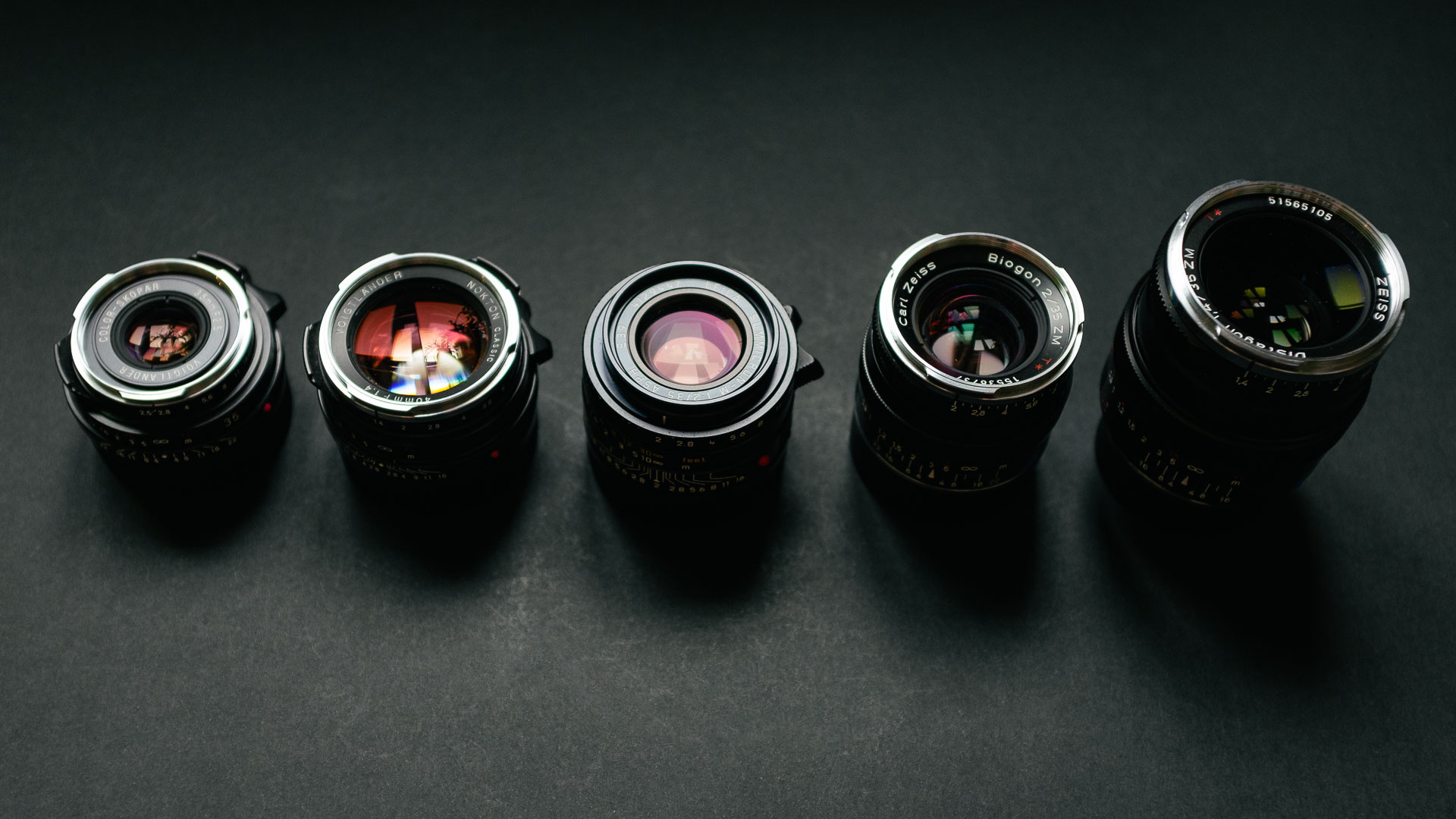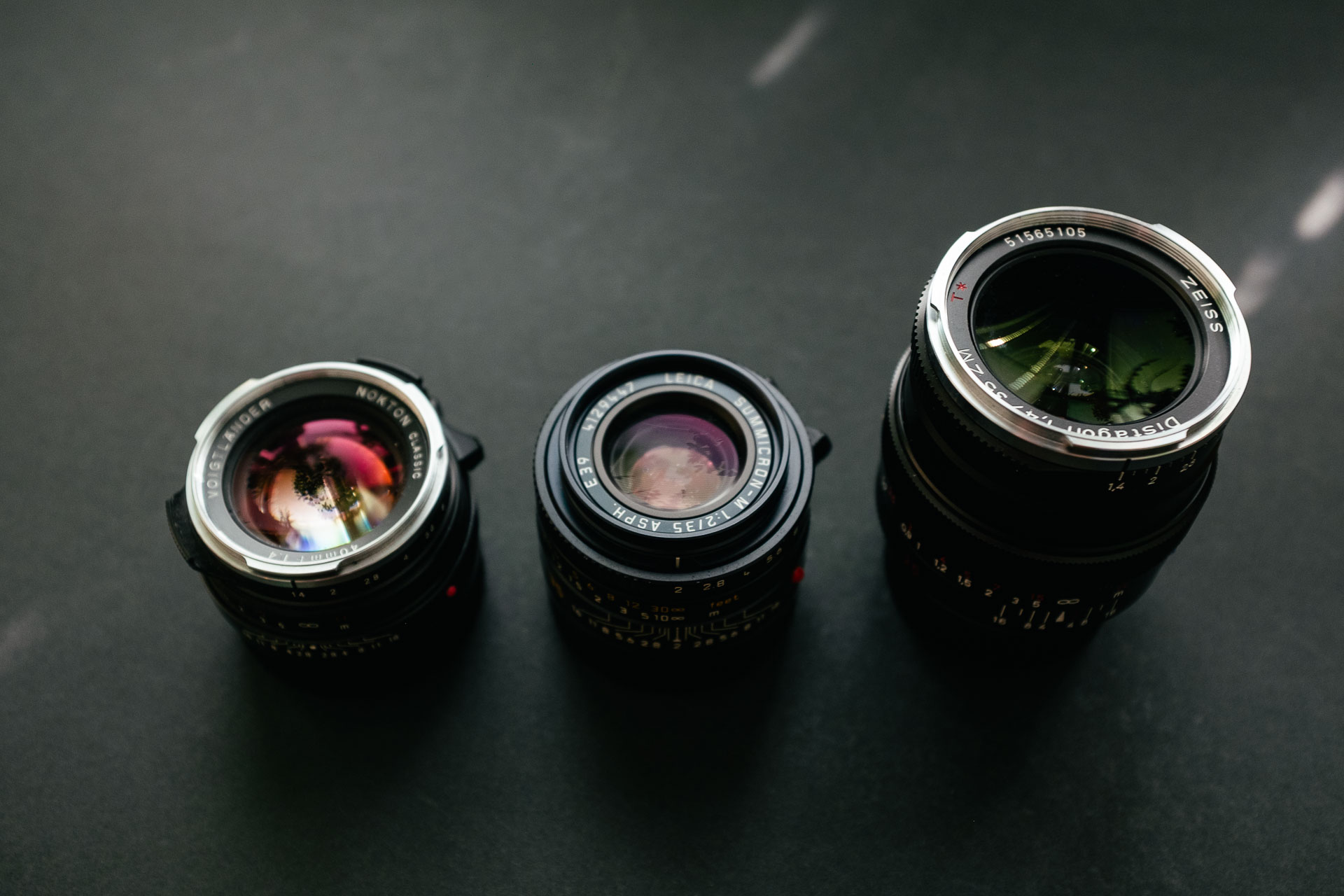 The variety of lenses available for the M-mount is one of my favorite aspects with it. Depending on what you want to prioritize there’s likely a great fit available. In the 35mm range, if you prioritize speed and a small size but are willing to compromise on performance, then the Voigtländer 40/1.4 on the left here is an excellent choice. If you want something really well rounded it’s hard to beat the Summicron 35 ASPH, seen here in the middle. If you want speed and performance and feel ok with a larger size, then the ZM Distagon on the right is very compelling.