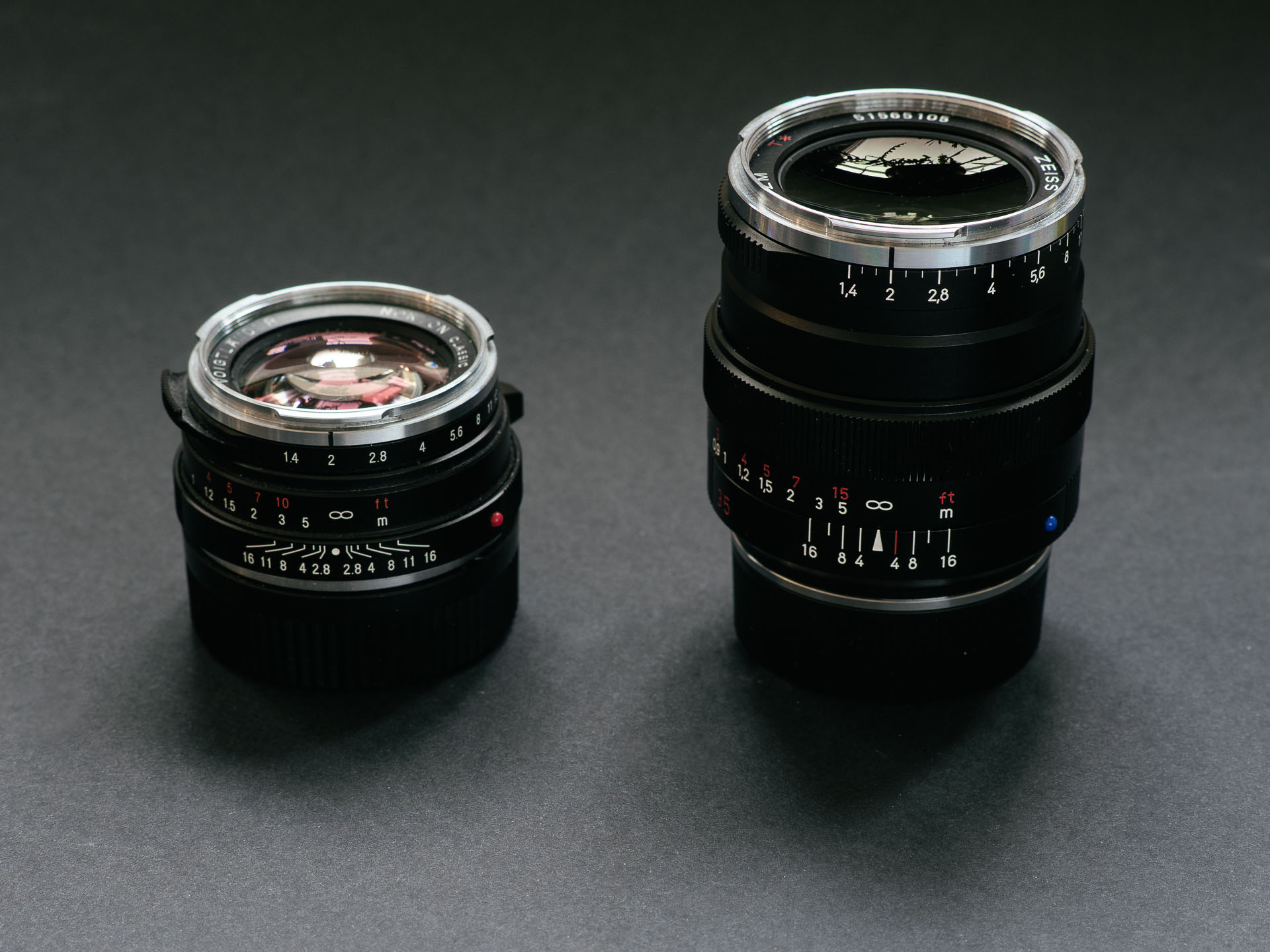 To make this talk about different lens designs a bit more tangible, have a look at these two lenses side by side. The Voigtländer 40/1.4 on the left uses a traditional, symmetrical design based on the double gauss formula. It results in an incredibly compact piece of kit, but it’s nowhere near as well corrected as the ZM 35 Distagon, seen here on the right.